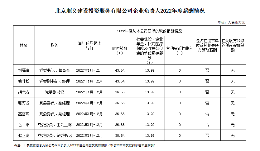 北京順義建設(shè)投資服務(wù)有限公司企業(yè)負(fù)責(zé)人2022年度薪酬信息披露