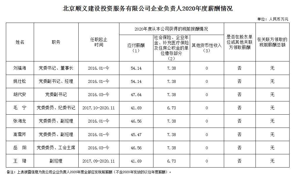 北京順義建設(shè)投資服務(wù)有限公司企業(yè)負責人2020年度薪酬信息披露